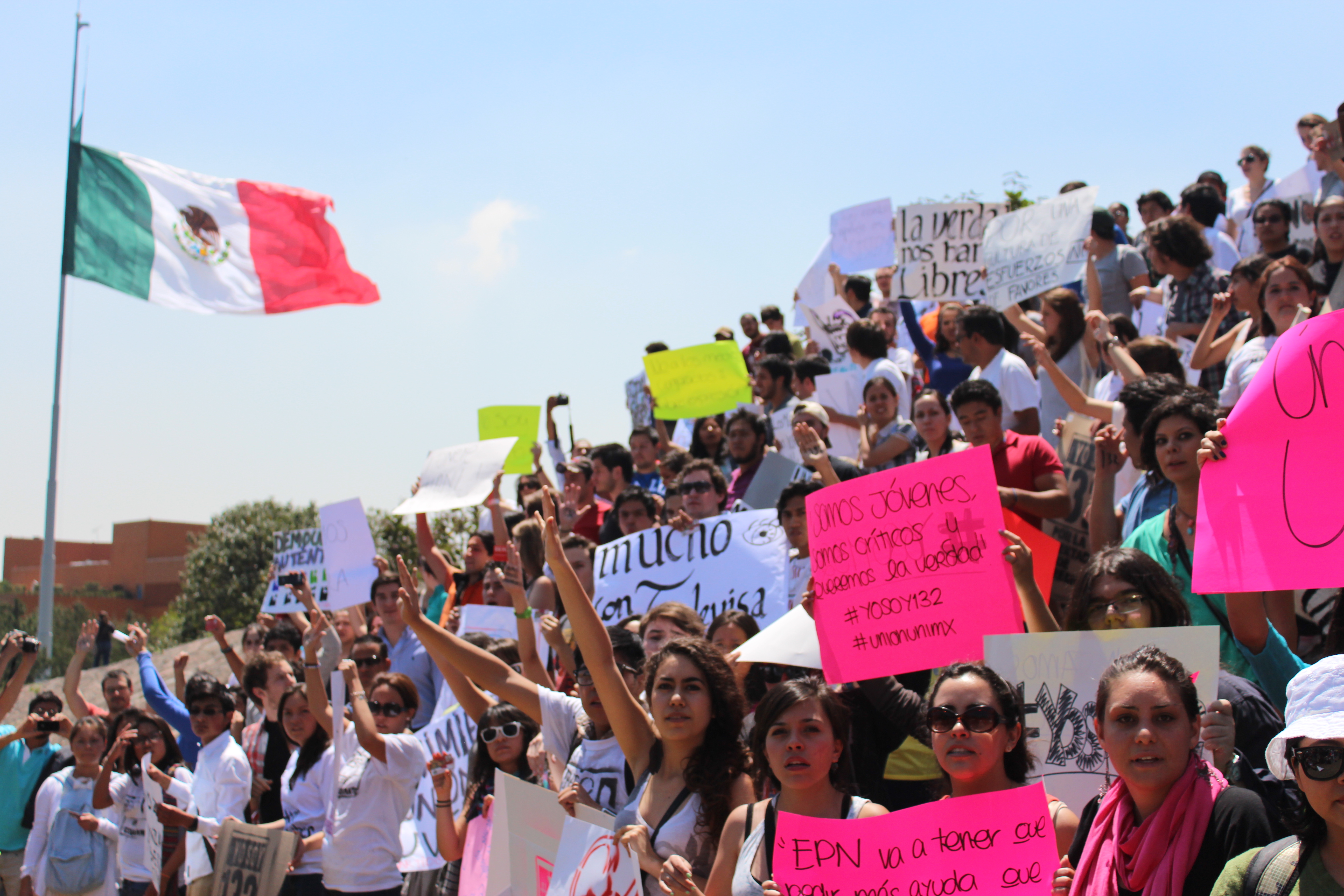 Students from public and private colleges united. Universities all across the country showed their approval to the movement, and began organizing marches demanding transparency in the management of information in the Mexican media. On Friday 19th May, there were two main marches, one from ITAM College to Televisa San Angel, and other students from Universidad Iberoamericana to Televisa Santa Fe. Televisa is a Mexican multimedia mass media company and largest in Latin America and in the Spanish-speaking communities.  About a thousand students joined, carried placards and demanded to this monopoly to show information truthful and neutral to any party.